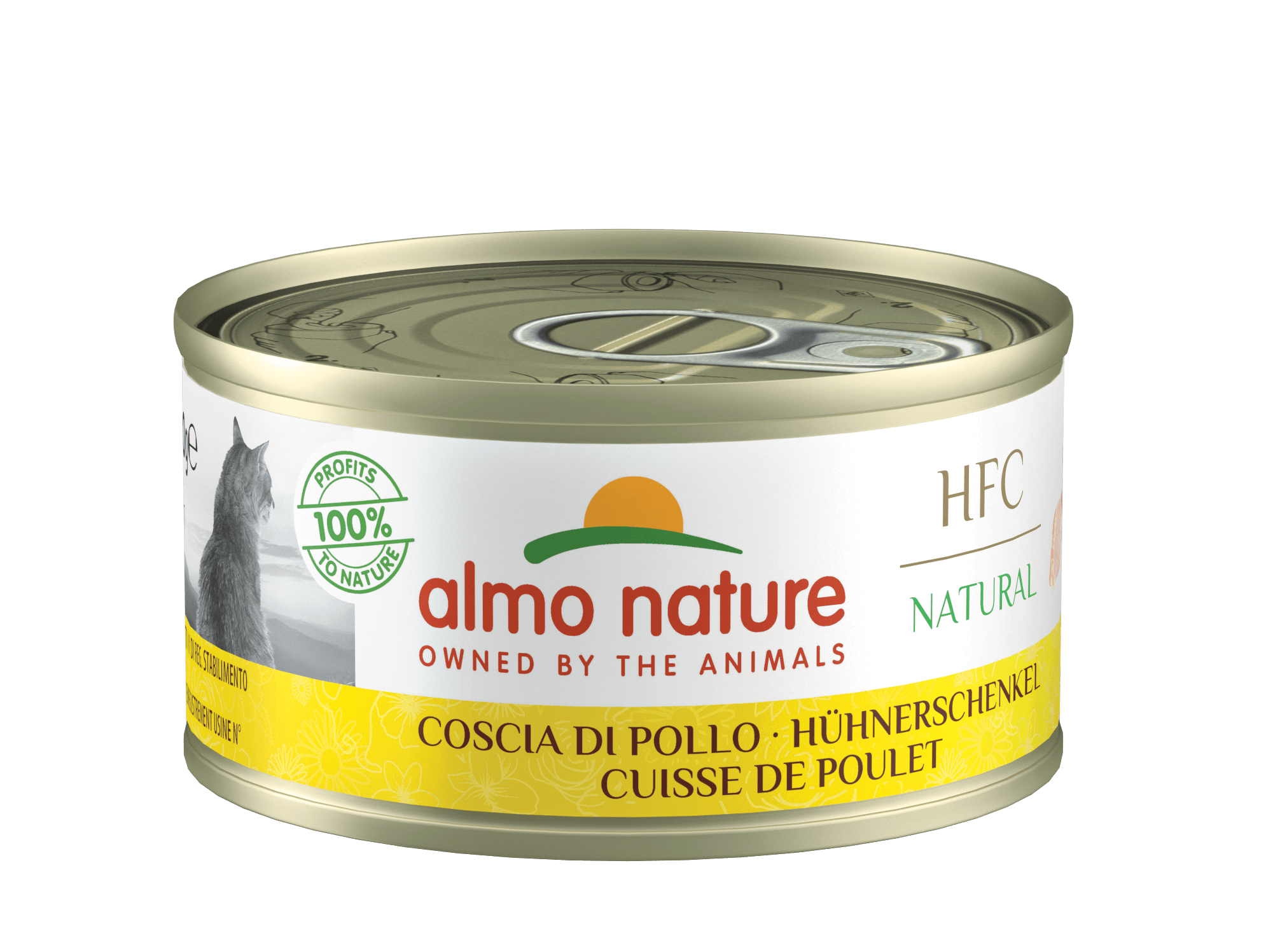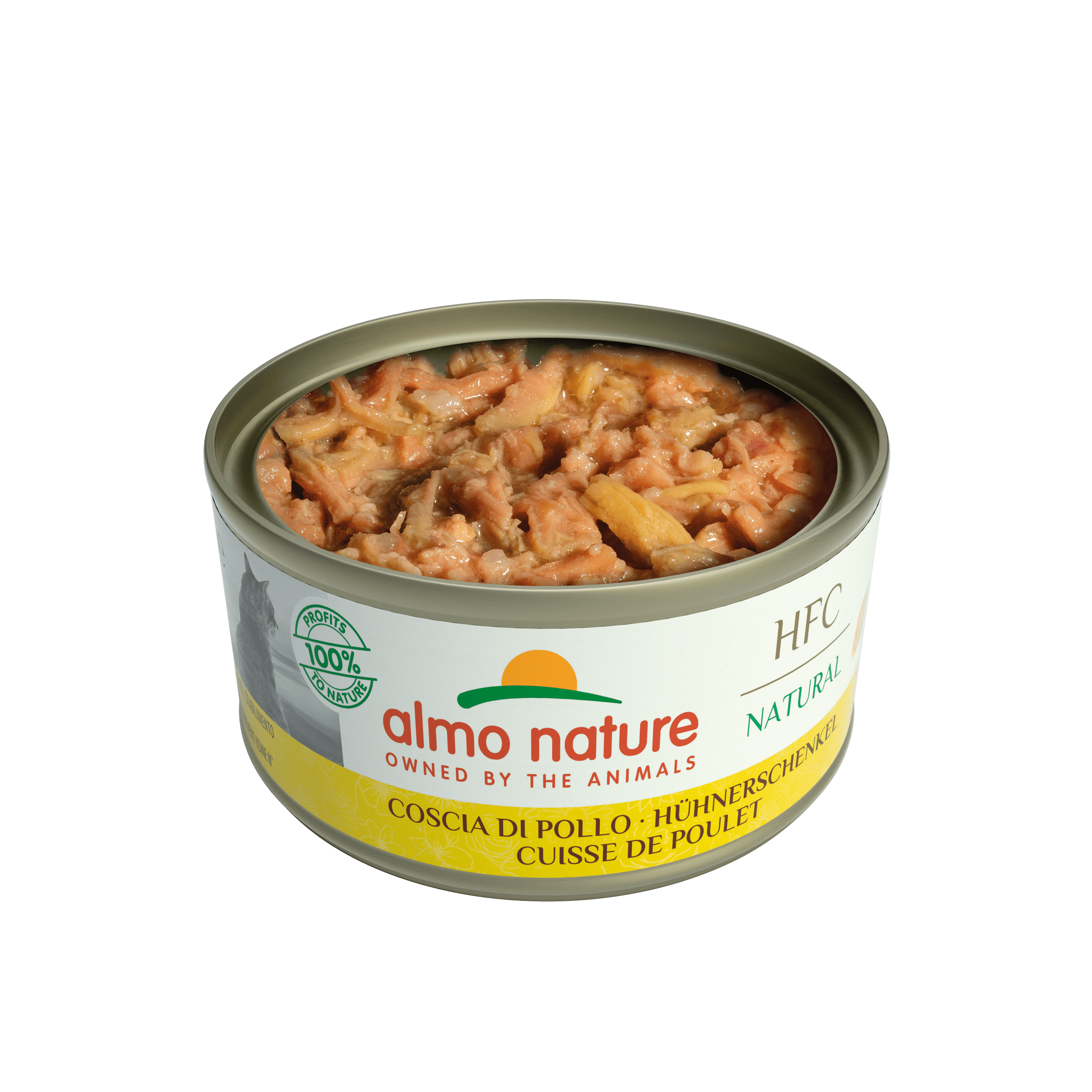 Almo Nature Cuisse de Poulet garantit un apport naturel en protéines animales, pour un bon équilibre alimentaire. Cuites simplement au bouillon, sans additifs chimiques ni colorants alimentaires, les recettes Natural sont idéales pour l’hydratation naturelle du chat.