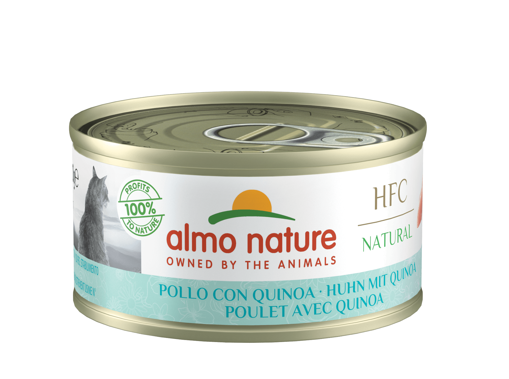 Almo Nature Poulet Quinoa garantit un apport naturel en protéines animales, pour un bon équilibre alimentaire. Cuites simplement au bouillon, sans additifs chimiques ni colorants alimentaires, les recettes Natural sont idéales pour l’hydratation naturelle du chat.