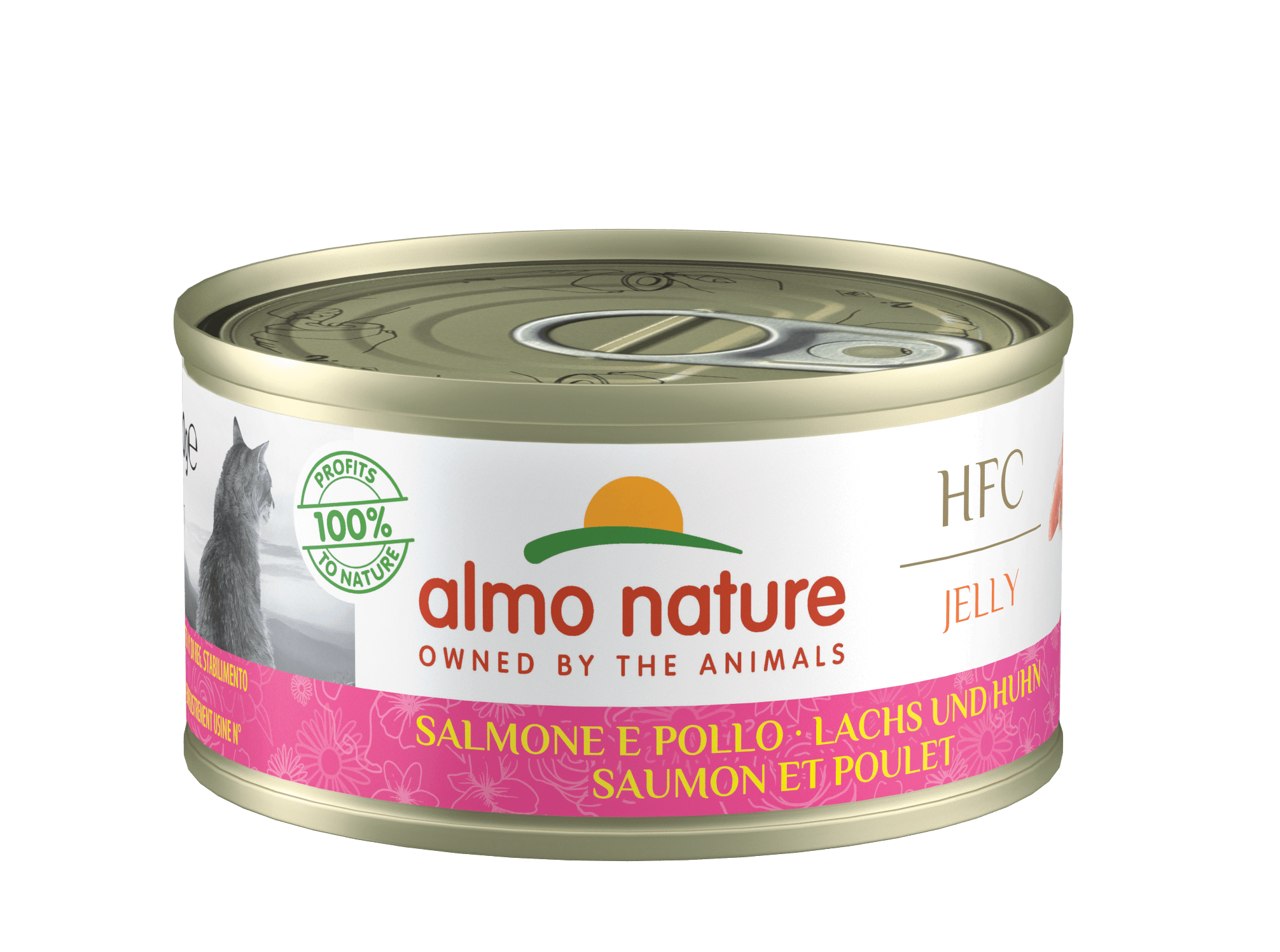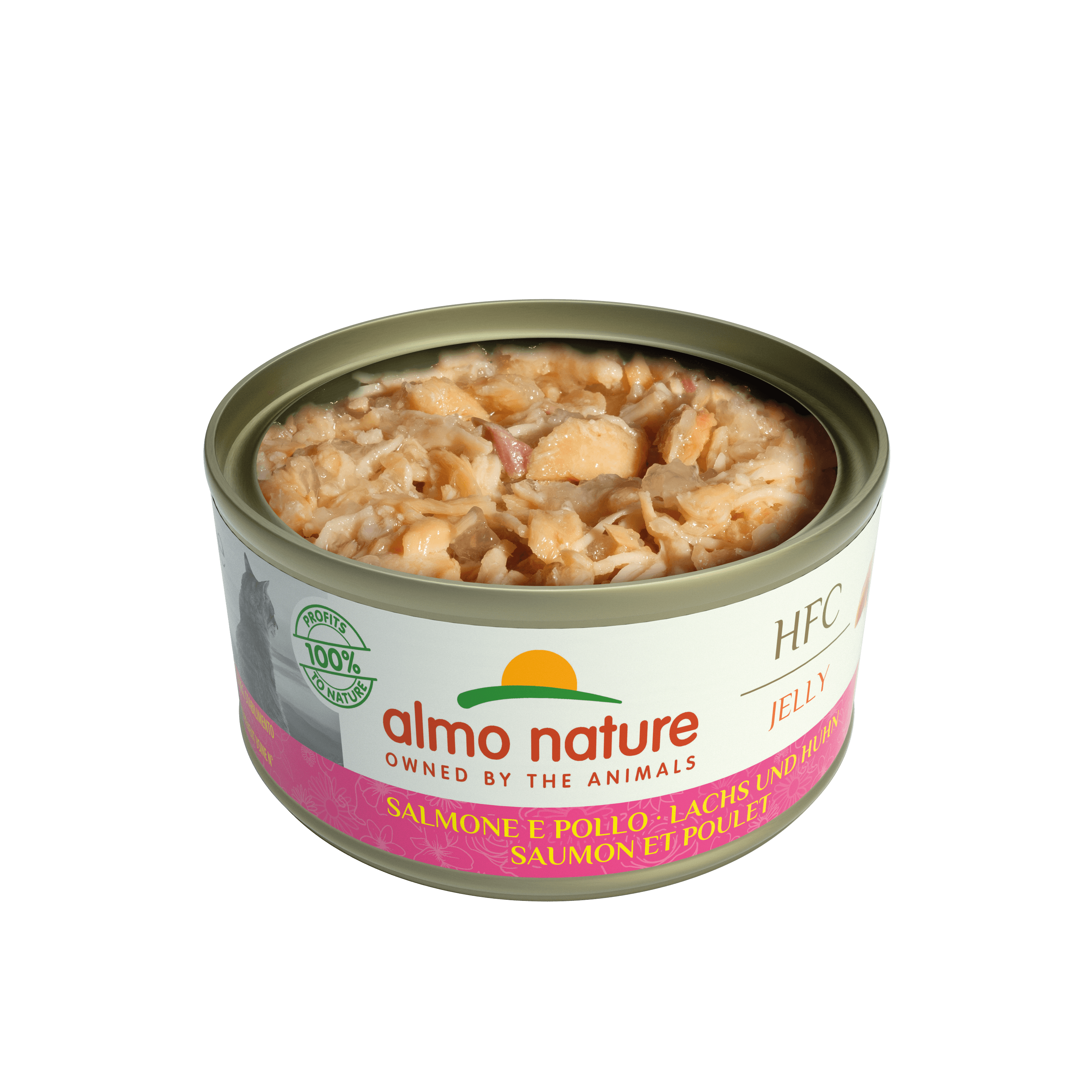 Almo Nature Jelly Saumon et Poulet garantit un apport naturel en protéines animales, pour un bon équilibre alimentaire. Cuites simplement au bouillon, sans additifs chimiques ni colorants alimentaires, les recettes Jelly (en gelée) constituent une aide précieuse pour l’élimination des boules de poil, grâce à leur gélatine végétale.