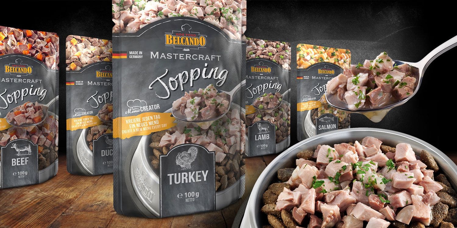 Belcando a créé pour votre chien 5 saveurs de garnitures à ajouter aux croquettes Mastercraft de Belcando, ou à l’alimentation sèche de votre chien.