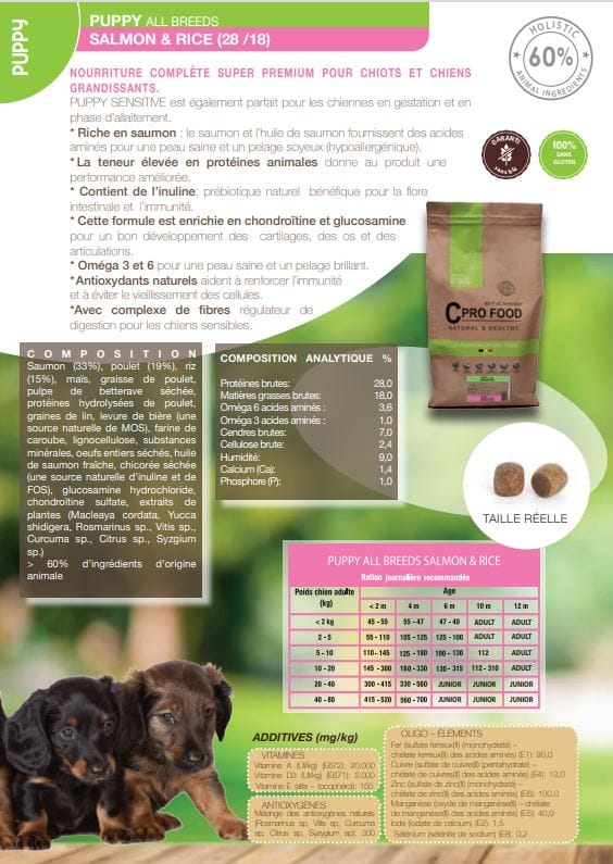 Ingrédients des croquettes CProFood Chiot Saumon Riz :