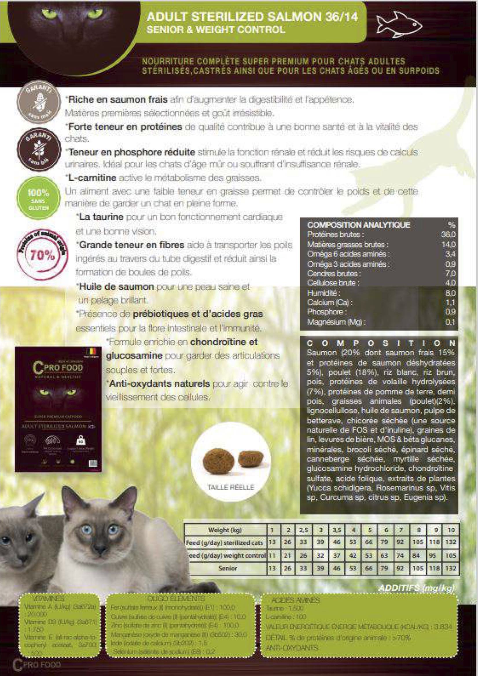 Saumon 20% (dont saumon frais 15%, protéines de saumon déshydratées 5%), poulet (18%), riz blanc, riz brun, pois, protéines de volaille hydrolysées (7%), protéines de pomme de terre, demi-pois, graisses animales (poulet) 2%, lignocellulose, huile de saumon , pulpe de betterave, chicorée séchée, graine de lin, levure de bière, mos & bêta glucanes minérales, brocoli séché, épinards séchés, canneberges séchées, myrtilles séchées, glucosamine hydrochloryde, chondronine sulfate, acide folique, extraits de plantes (yucca schidigera, rosemarinus sp, vitis sp, curcuma sp, citrus sp, eugenia sp.