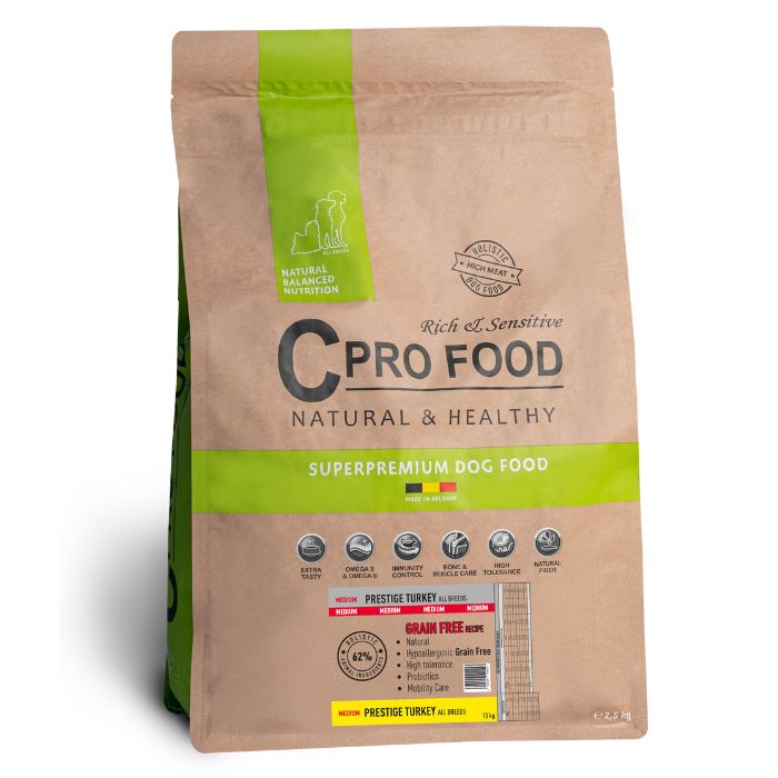 Les croquettes CProFood Prestige Dinde Medium sans céréales sont un aliment complet formulé pour les chiens adultes.