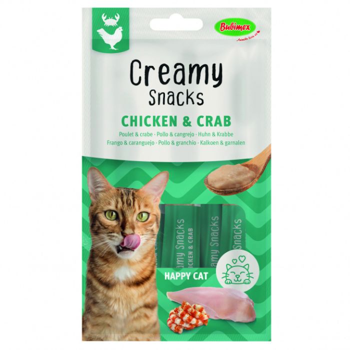 Les Creamy Snacks Poulet Crabe Bubimex sont des friandises liquides pour chats à la texture crémeuse. Elles peuvent être utilisées comme récompenses ou comme nappage sur le repas !