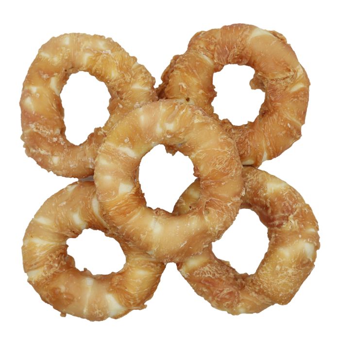 Ces donuts au poulet constituent un snack à la fois savoureux et fonctionnel. Des anneaux de peau de buffle enrobés de poulet ! Préparés avec de la vraie viande de poulet enroulée autour d’une peau de buffle digestible, ces anneaux ludiques répondent à l’instinct naturel de mastication tout en favorisant l’hygiène bucco-dentaire et la stimulation mentale.