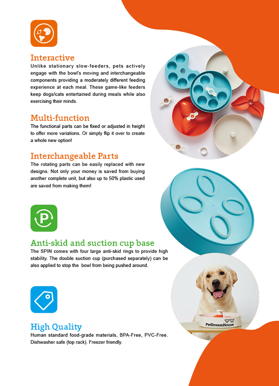 La gamelle interactive Spin Palette anti-glouton offre de nombreux avantages : elle réduit les risques de syndrome de dilatation-torsion d’estomac en ralentissant la vitesse d’ingestion, facilite la digestion et aide à lutter contre l’embonpoint et le surpoids.