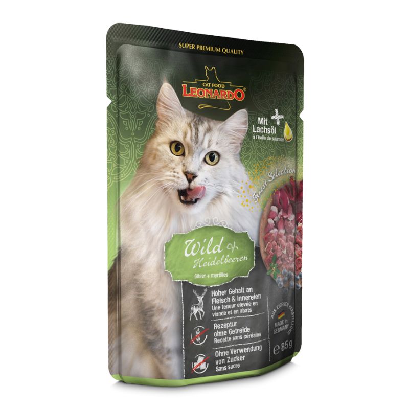 Leonardo gibier myrtilles 85g est un aliment humide sous forme de sachet fraîcheur pour chat adulte au goût de gibier avec des morceaux de myrtilles.