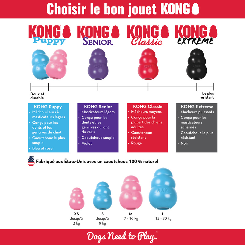 KONG (contact) est une marque anglaise de jouets pour chiens. Les jouets KONG encouragent le jeu, en satisfaisant les besoins naturels et en renforçant le lien entre vous et votre chien.