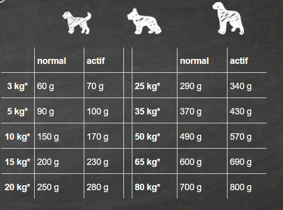 Le taux de protéines et de graisse est adapté aux besoins énergétiques du chien ayant une activité normale.