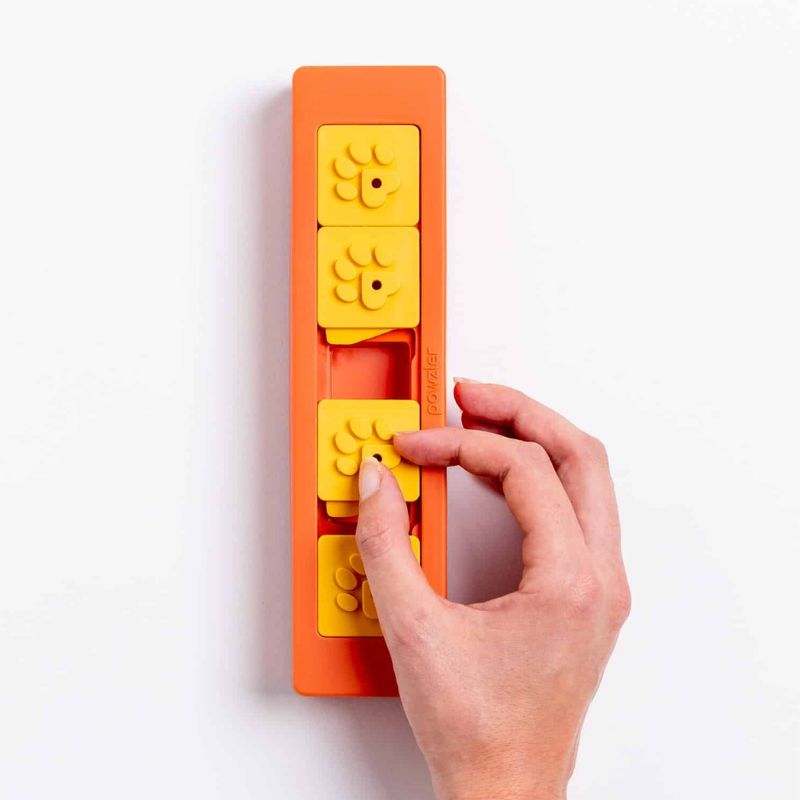 Zhu occupe 4 emplacements sur la base et propose un mécanisme basé sur des curseurs à pousser. Pour dévoiler les récompenses cachées, votre chien doit déplacer les glissières, ce qu’il peut faire avec son museau, sa langue ou sa patte.