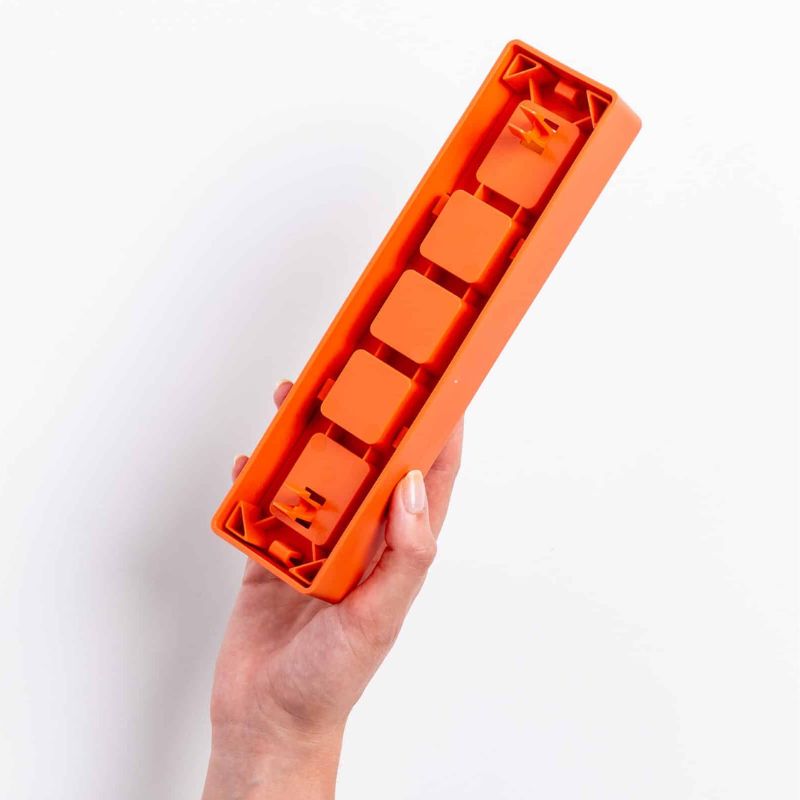 24 × 6 × 4,5 cm (L × l × H) — couleur orange clair avec curseurs jaunes.