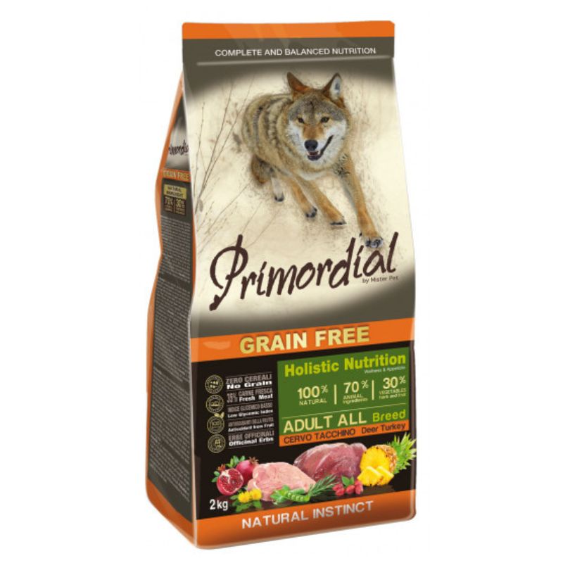 Les croquettes Primordial Cerf Dinde sans céréales sont formulées pour les chiens adultes actifs.