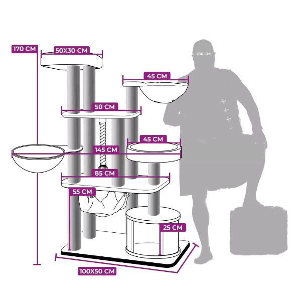 L’arbre à chats Vista 170 est le paradis de l’escalade pour tous les chats. Deux hamacs XL de 45 cm pouvant facilement transporter 25 kg seront l’endroit idéal pour que votre chat passe de nombreuses heures à rêver. Un grand siège, avec coussin sur le dessus, permet à votre chat de garder un œil sur son environnement. De plus, une corde de jeu pour se balancer, un hamac balançoire, un siège central et une grotte de couchage font de cet arbre à chat un véritable paradis.