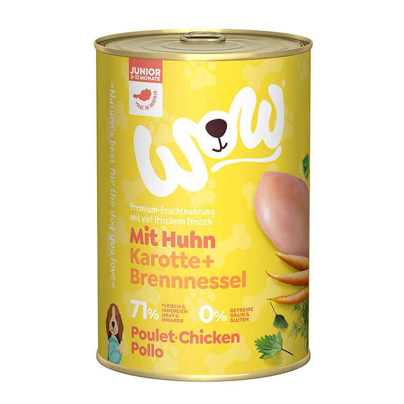 Wow Chiots Poulet Carottes et Ortie est un aliment humide sans céréales pour chiots et les chiens junior en croissance, de 2 à 12 mois.