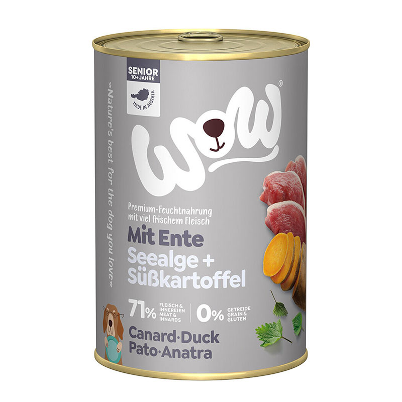 Wow Sénior Canard est un aliment humide sans céréales pour chiens adultes séniors.